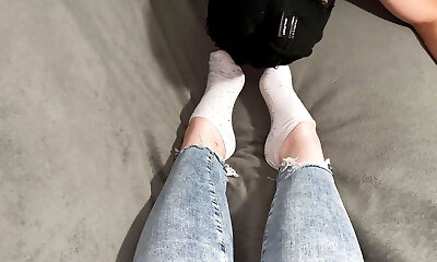 Sexy Busty Babe Gets Her Feet Worshipped by Horny Man
